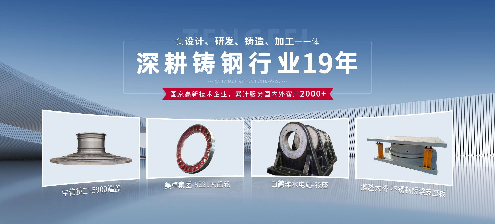 騰飛鑄鋼成立于2006年,位于全國鑄造基地河南省新鄉市,擁有員工300余人,是一家從事150噸以下碳鋼、低合金鋼、不銹鋼鑄鋼件研發、制造、服務為一體的國家高新技術企業。  公司通過了ISO9001國際質量管理體系認證,擁有2項發明專 利,2項河南省科技成果、25項實用新型技術,通過了“環??冃гu級B級企業”驗收,先后榮獲“河南省鑄造行業綠色發展企業”、 “河南省科技型中小企業”、“河南省專精特新中小企業”等榮譽稱號?! 」緭碛?臺25噸電爐,4臺大型天燃氣熱處理爐、10米回旋自動拋丸機一臺, φ8m數控立車、φ10m數控滾齒機等各類高精裝備100余臺套,年產能3萬余噸,能為客戶提供從產品設計、木模加工、大型鑄造、大型加工一站式服務,產品廣泛應用于建材、冶金、鍛壓、冶金、水工、路橋、化工等多個重型行業?! ¢L期服務于中信重工、中船重工、美卓、上海中交、萊歇、寶武、濟南重工等全球知名企業,在行業內擁有較高的市場知名度和美譽度。